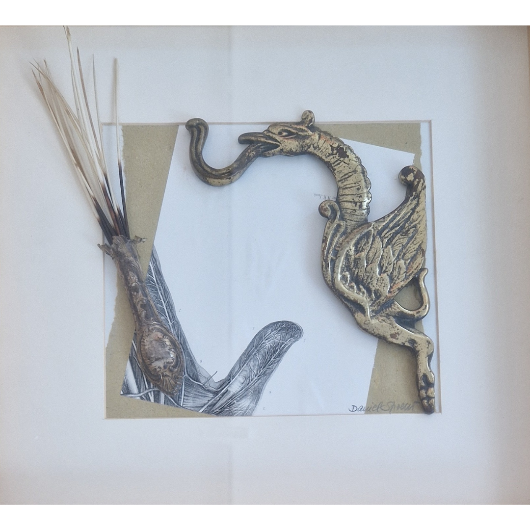 Auf der Rückseite des Rahmens (von Daniel Spoerri?) mit Bleistift geschrieben: „Vendredi 13 juin 97, An diesem Freitag, dem 13., wenn der Drache sein giftiges Feuer auf den Stachelschweinbesen mit dem silbernen Griff speit, ist es der Unglückstag der kleinen Fliege, den sie nicht überleben wird …”
