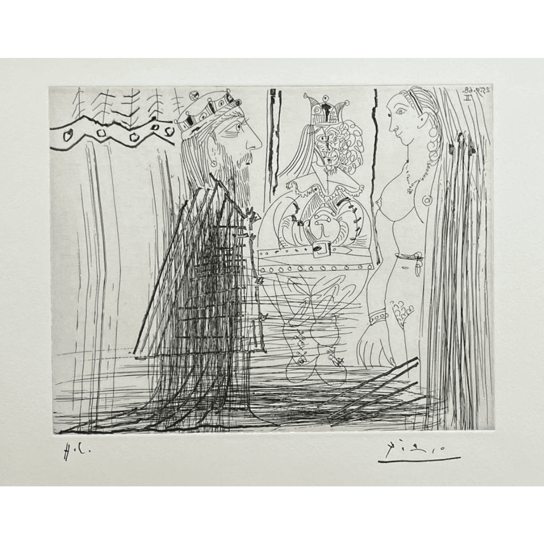 Scène biblique (David et Bethsabée?), avec bouffon au chapeau à deux cornes